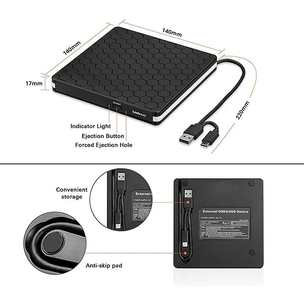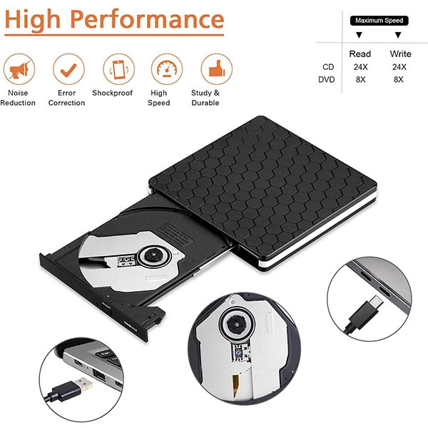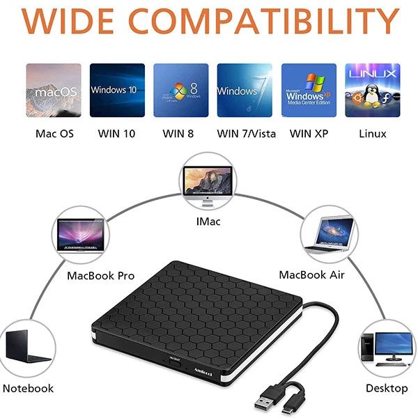 درایو دی وی دی خارجی با سازگاری گسترده: درایو سی دی/ دی وی دی خارجی برای لپ تاپ کامپیوتر رومیزی سیستم عامل لینوکس Apple Mac Macbook Pro. سی دی رایتر سازگار با ویندوز XP/Vista/7/8.1/10، لینوکس، تمامی نسخه های MAC OS. برای دسکتاپ ها، این درایو cd usb باید به پورت usb متصل باشد. DVD Burner -Plug & Play USB : بدون نیاز به منبع تغذیه. کافی است آن را به پورت USB خود وصل کنید، سپس درایور دی وی دی شناسایی می شود. درایو سی دی خارجی قابل حمل - باریک و جمع و جور: طراحی کابل جاسازی شده با بدنه باریک و سبک وزن، این درایو خارجی سی دی را می توان در کیف مسافرتی خود قرار داد و در هر زمان وصل کرد، که آن را به همراهی برای کامپیوترهای بدون درایو داخلی تبدیل می کند. درایو نوری چند منظوره: با استفاده از فناوری رایت هوشمند، میتوانید به راحتی دیسک خود را بخوانید/رایت کنید یا ضبط را قطع کنید. طراحی دکمه پاپ آپ و سینی دیسک خواندن یا نوشتن دیسک ها را راحت می کند.